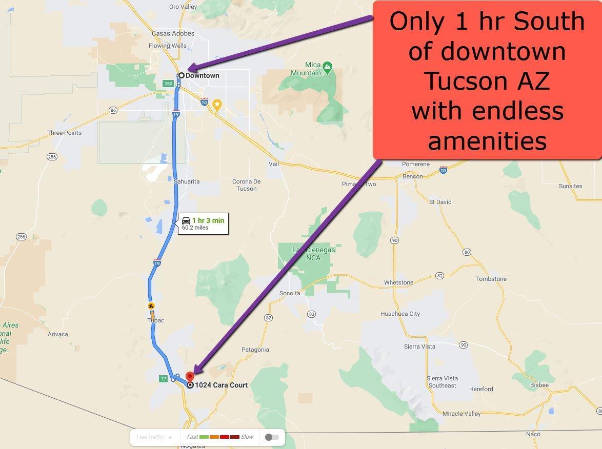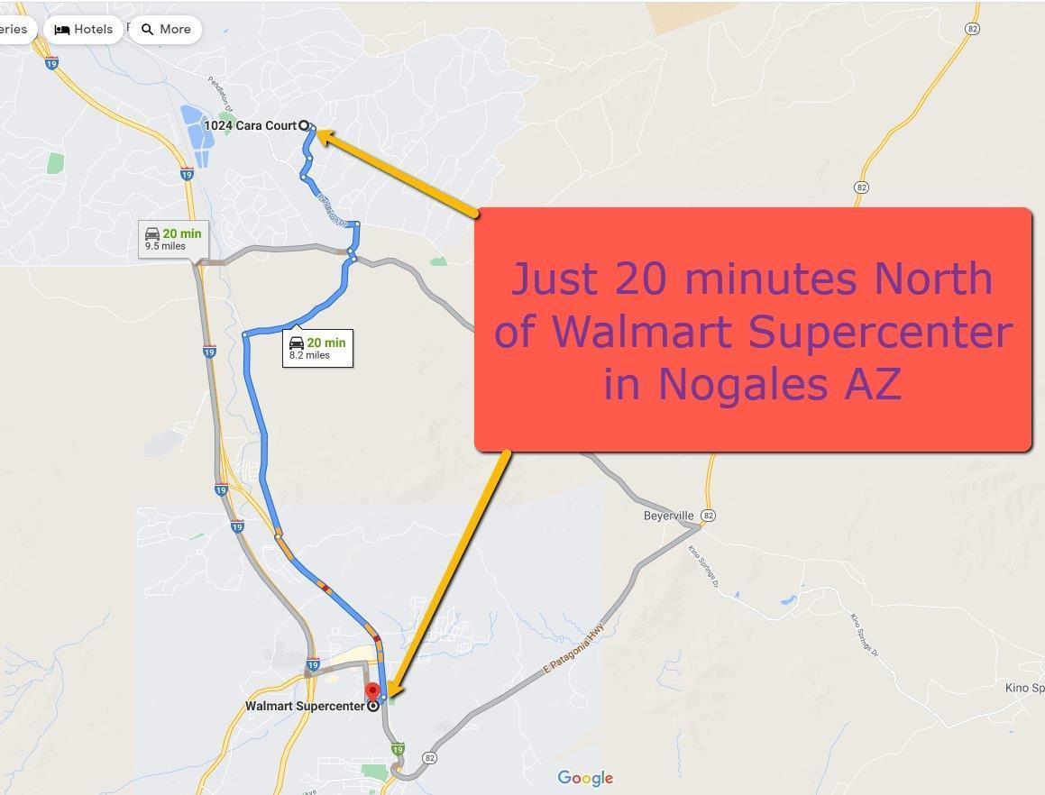 From downtown Tucson AZ, get on I-10 E, Use the left 2 lanes to merge onto I-10 E via the ramp to I-19, Follow I-19 S to Rio Rico Dr in Rio Rico. Take exit 17 for Rio Rico Dr toward Yevapai Dr, Turn left onto Rio Rico Dr, Turn right onto Pendleton Dr, Turn left onto Via Fray Marcos, Slight right onto Via Casa, Turn left onto Paseo Mascota, Turn left onto Odisea Ct, Turn left onto Cara Ct, Follow to 1024 Cara Ct.