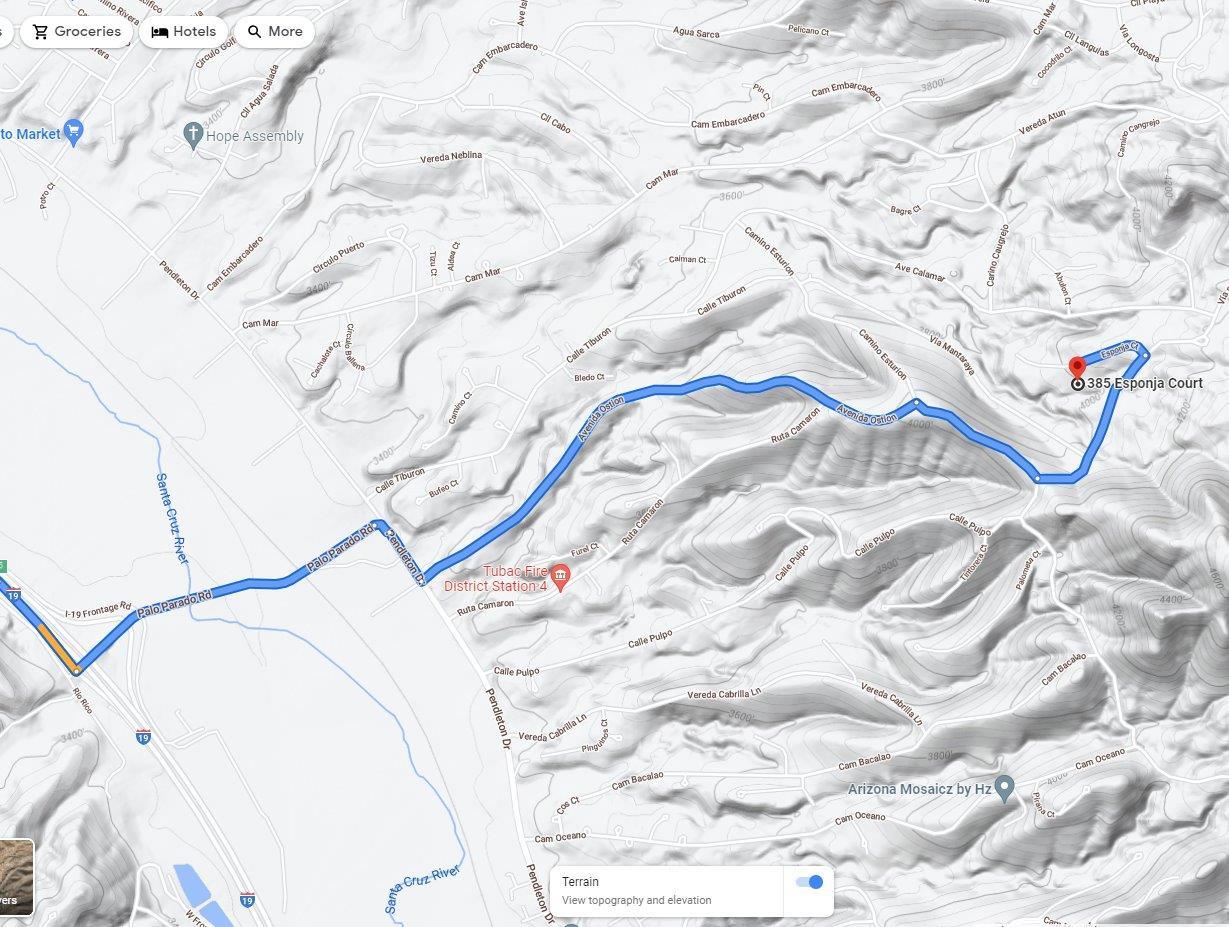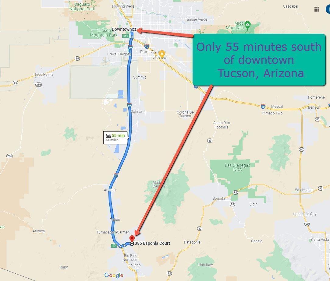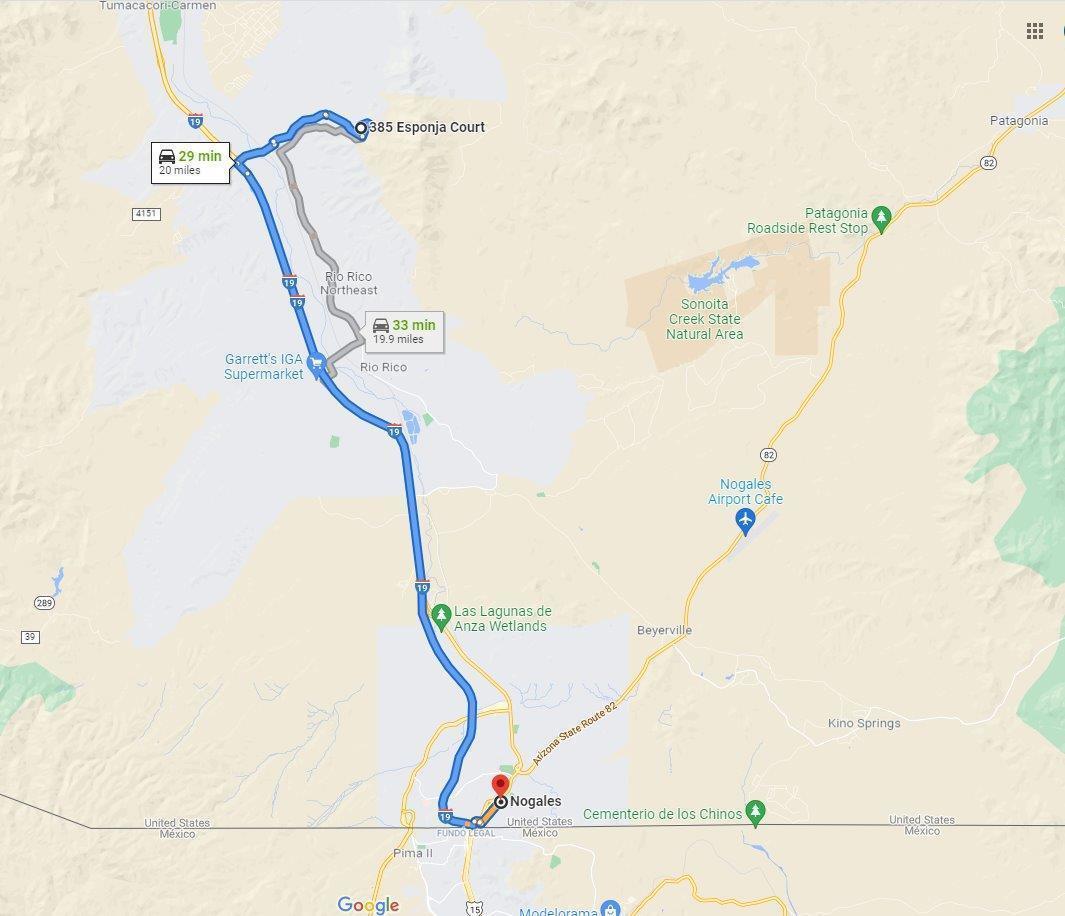 Directions: Take Exit 17 to Rio Rico Dr. Take exit 17 from I-19 S, Turn left onto Rio Rico Dr, Turn left onto Pendleton Dr, Continue on Avenida Ostion. Drive to Esponja Ct, Turn right onto Avenida Ostion, Turn right onto Camino Esturion, Turn left onto Vía San Cayetano, Turn left onto Esponja Ct, Destination will be on the left